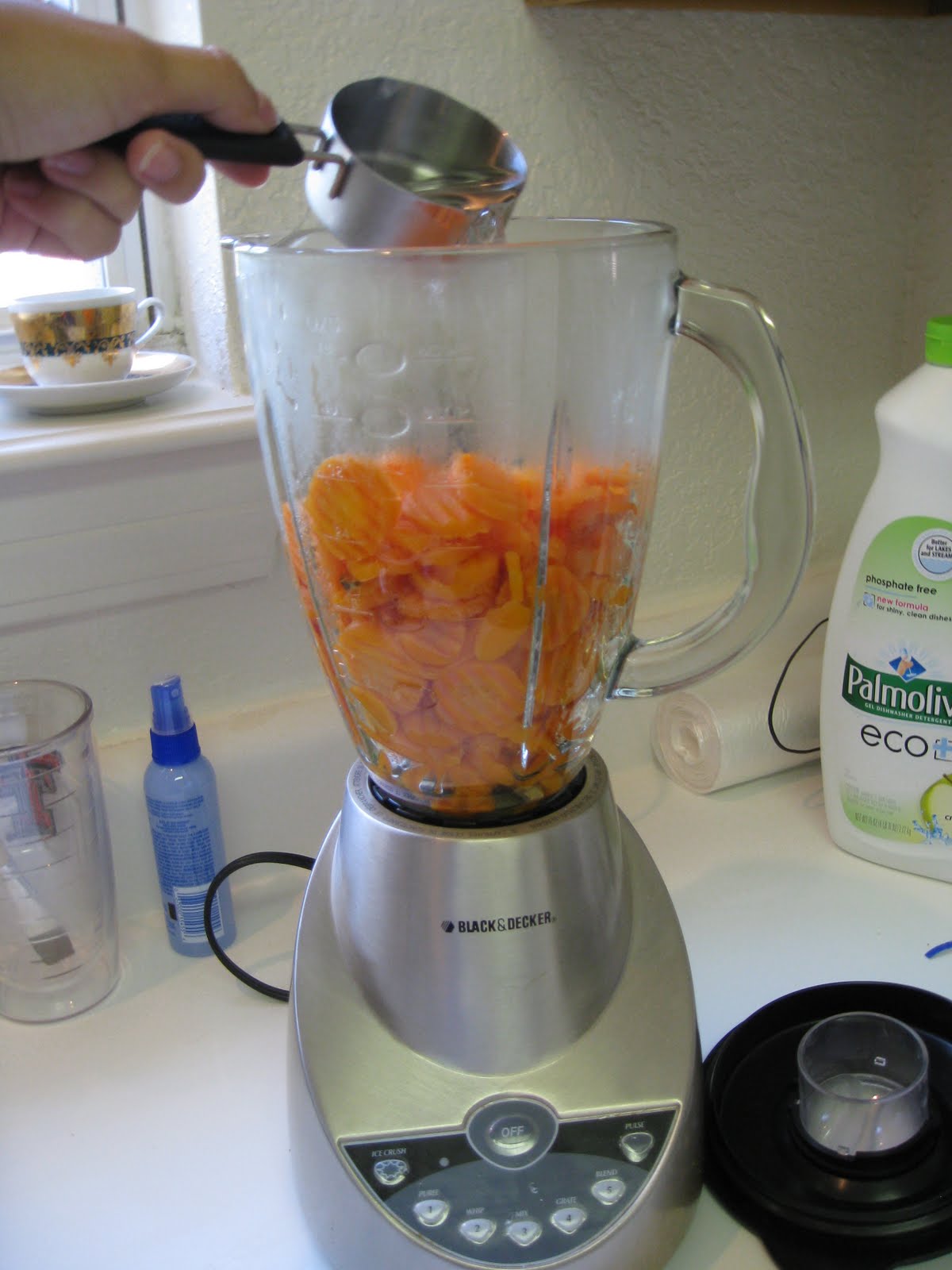Pour carrots into blender or food processer and add 1/2 cup of water. Puree. You can add as much additional water as you would like to achieve a desired consistancy. I add water slowly until my blender is capable of moving all of the food freely and it is entirely pureed. For the carrots, I added an additional 1/2 cup of water. My daughter sometimes has a problem with food that isn't "thick" enough, so instead of rice cereal made with breastmilk, we add a little rice cereal to her solid foods.